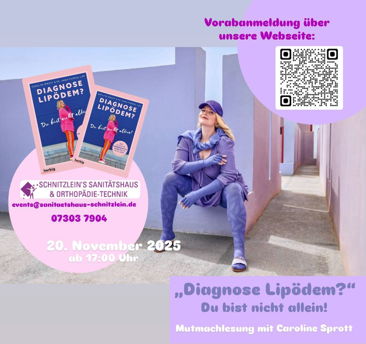 Mit ihrer unverwechselbaren Mischung aus Humor, Fachwissen und persönlicher Erfahrung schafft sie eine Atmosphäre, in der sich jede*r gesehen und verstanden fühlt. Sie liest nicht nur aus ihrem Buch, sondern erzählt auch von den Herausforderungen, den Erfolgen und den vielen kleinen Momenten, die Mut machen. Dabei zeigt sie, dass ein Leben mit Lipödem nicht von Verzicht, sondern von Selbstbestimmung und Stärke geprägt sein kann.