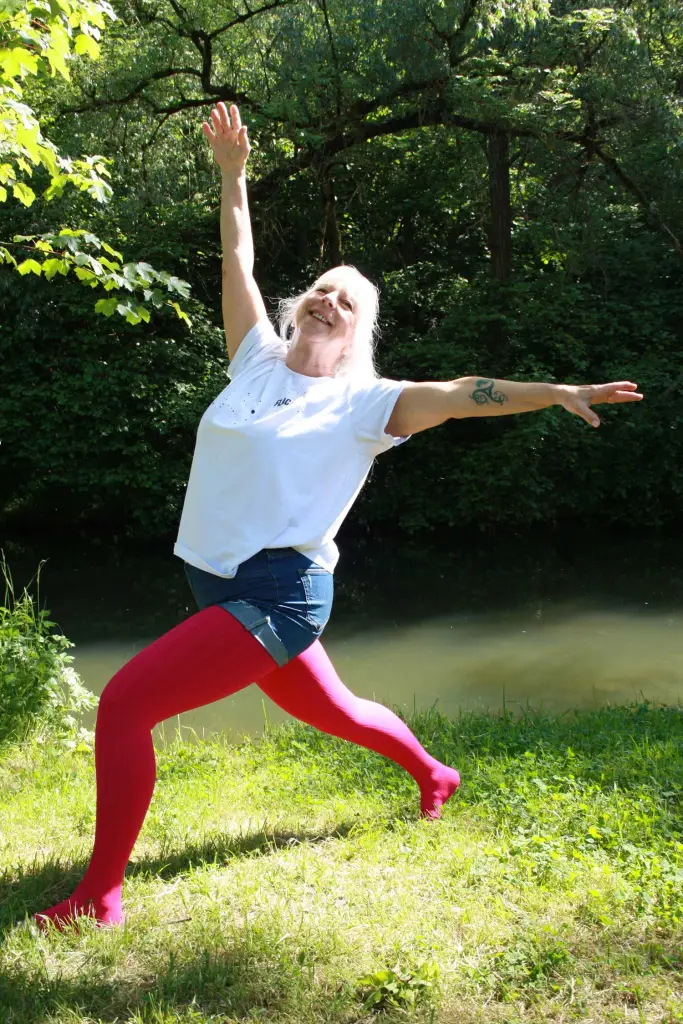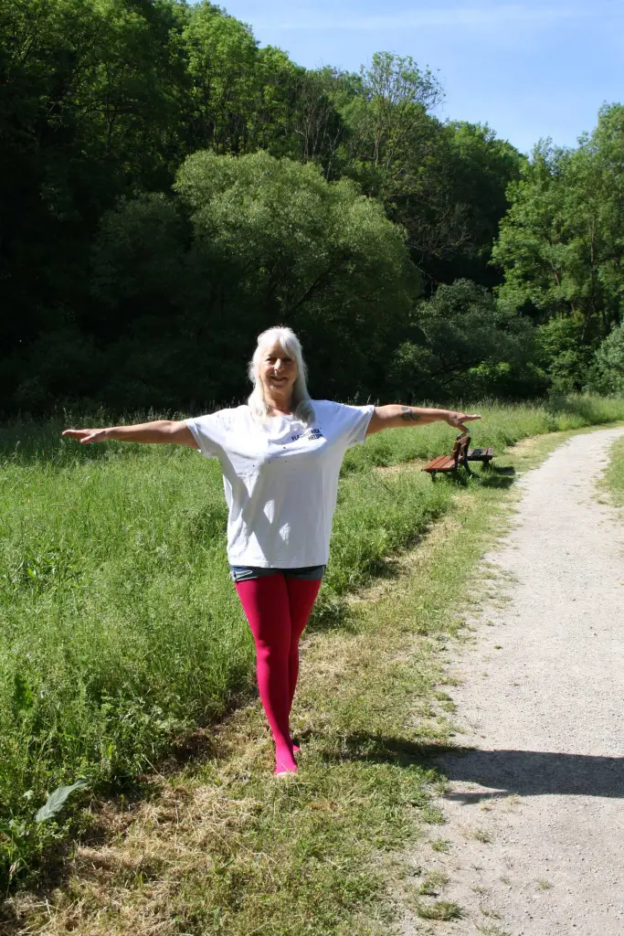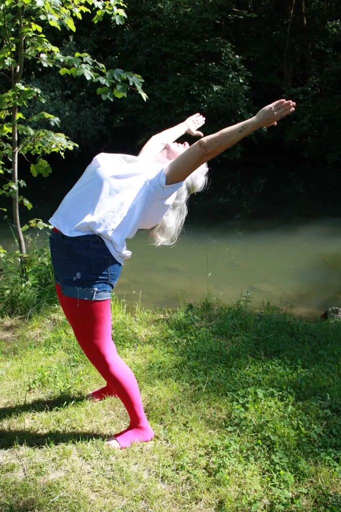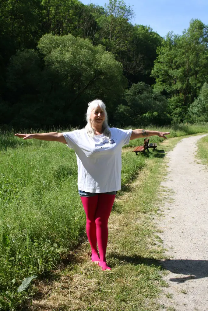 hinten/oben, der Blick geht nach oben: stellt Euch vor, Ihr atmet durch Mund und die Fingerspitzen nach oben und in das Universum aus und ein (eine Vorstellung, die es mir in meiner aktiven Zeit im Bühnentanz erleichterte, imaginären Kontakt zum Publikum herzustellen). Wieder 5 Mal durchatmen und wieder zurück, das Gleiche dann mit dem anderen Bein vorne und zur anderen Seite geneigt.