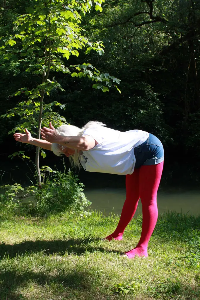 Die Ausgangsposition bleibt gleich, mit Füßen hüftbreit parallel und geradem Rumpf. Die Arme wandern wieder neben den Ohren nach oben, aber wir beugen uns vom Hinterkopf bis zum Gesäß in gerader Linie nach vorne, soweit es geht, Nase und Blicke nach unten. Wieder fünfmal atmen und vorsichtig wieder die Haltung auflösen, ggf. den Rumpf mit den Händen auf den Oberschenkeln abstützen, Rücken beugen und strecken, aufrichten. Diese Übung streckt und kräftig rückwärtige Bein- und Rumpfmuskulatur.
