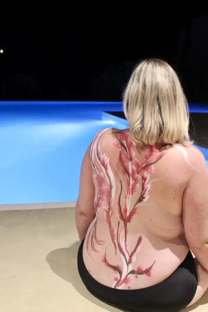 Tag 3 startete entspannt und wir hatten Zeit für uns und genossen die Sonne. Am Nachmittag wurde uns dann die nächste Aufgabe präsentiert; das Bodypainting. Wir durften selbst Motive wählen. Als ich in mein Zimmer ging, dachte ich daran, mich maximal in Unterwäsche zu zeigen und dunkle Farben zu wählen. In meinem Zimmer wartete Liz Webster auf mich. Wir beide hatten schon am Tag zuvor ein kurzes Gespräch und direkt einen Draht zueinander. Ich war erleichtert und bereit mich auf das Projekt einzulassen. Liz fragte mich, was ich mag und was meine Lieblingsfarben sind. Ich fühlte mich gut aufgehoben und entschied mich spontan, das malen zu lassen, was ich mag und mich ausmacht. Und mich machen definitiv keine dunklen Farben aus. Ich wählte weiß, rosa und pink. Liz zauberte ein wundervolles Blumenmuster. Wir quatschten über Gott und die Welt, über meine Familie und meine Tochter. Wir hatten die Idee, die Liebe von Mama und Kind darzustellen und das einzige Motiv, das Liz dazu dabei hatte, war ein Hirsch mit einem Kitz. Passender hätte es nicht sein können. Danke Universum.