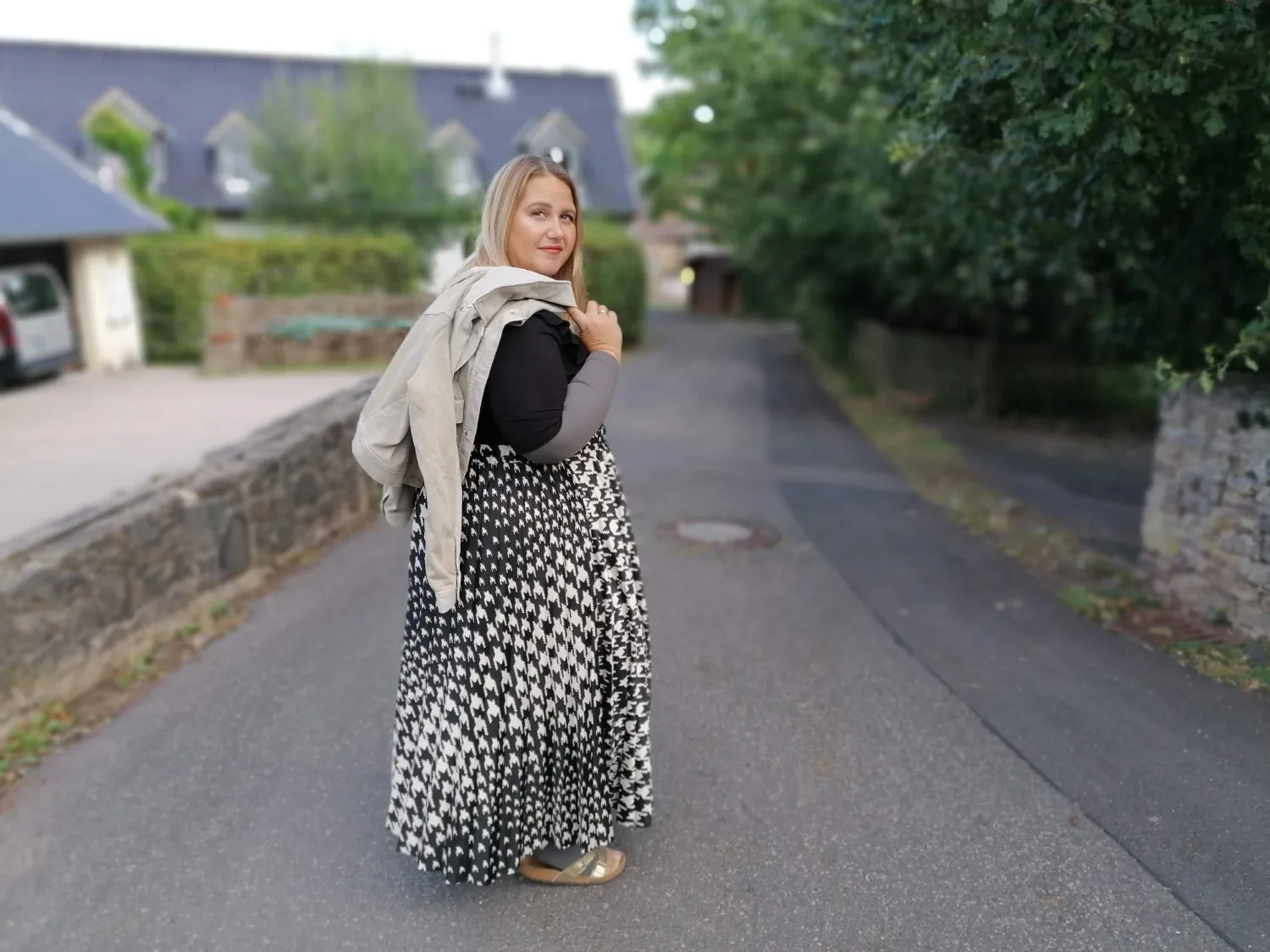 Das Shirt ließ ich beim Rock anfangs raus hängen. Bei Hosen hatte ich es zuvor immer seitlich etwas rein gestopft, um die Hüften zu kaschieren. Diese Lösung sah beim Rock durch die fehlende Streckung nach unten nicht vorteilhaft aus. Zwar bedeckte ich dadurch meine breiteren Hüften und meinen Po, jedoch sah ich auch von oben bis unten wie ein Kasten aus. Also probierte ich es einfach aus und steckte das Shirt in den Rock, um eine Silhouette zu schaffen. Die ersten Male zog ich noch eine Strickjacke oder einen Blazer darüber, welche mir Sicherheit verschafften. Diese lasse ich mittlerweile weg.