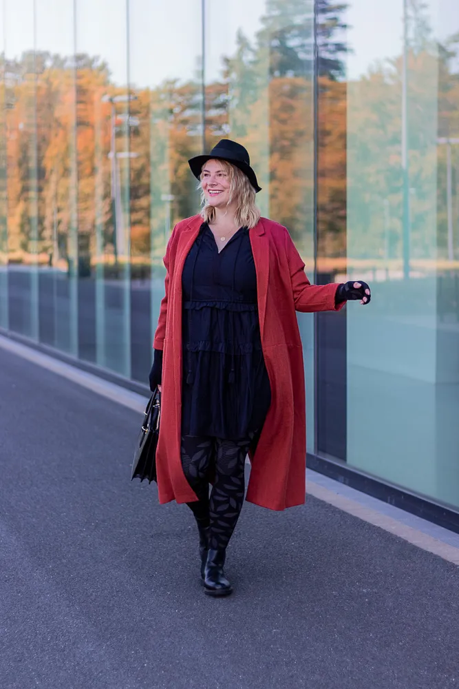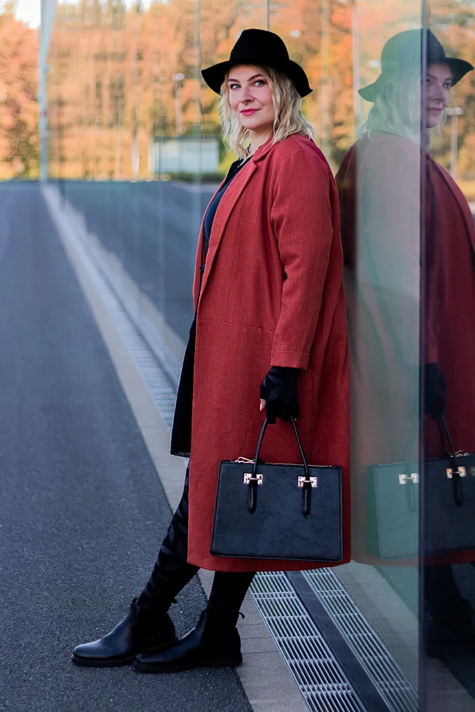 Nehmen wir jetzt einmal Schwarz als Farbe, so wie ich es dir mit beigen Farben auch immer empfehle, dann braucht auch sie einen Anhaltspunkt in deinem Look. Vielleicht findet sie sich in deinen Accessoires wieder oder bildet die Grundfarbe deines Outfits und eine andere Farbe setzt nur ein Highlight. So wie in meinem herbstlichen Look in diesem Artikel, wo nicht nur meine mediven 550 in Schwarz mit dem Fashion-Element Nature sich wunderschön einfügt, sondern auch der lange Mantel ein sonst sehr eintöniges Schwarz lässig umrahmt.