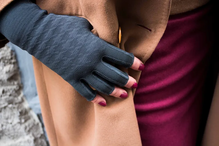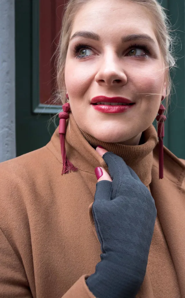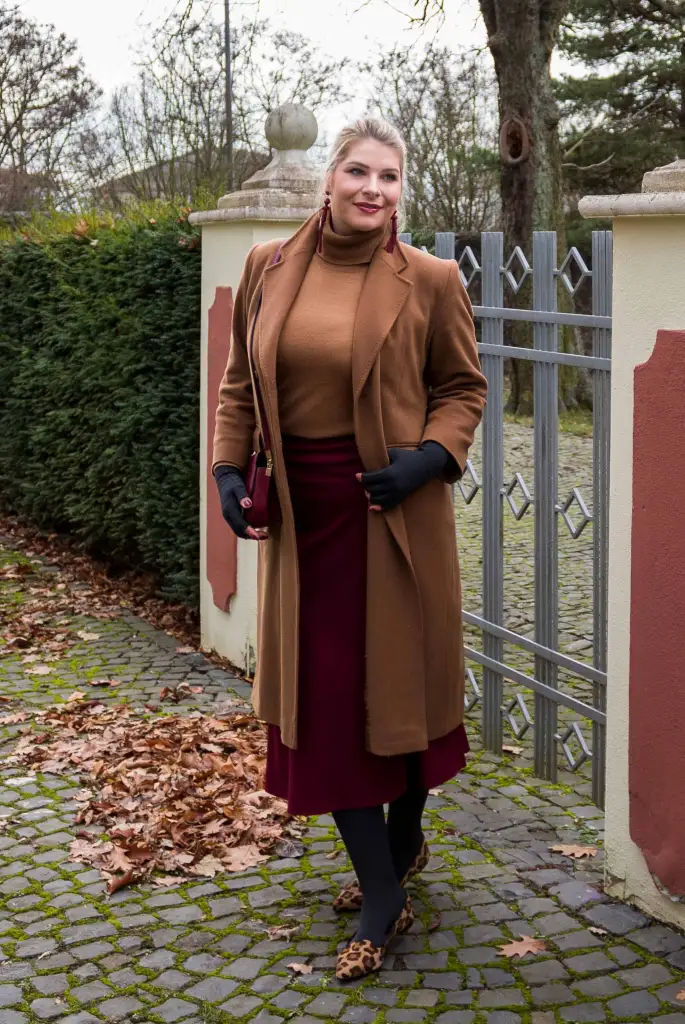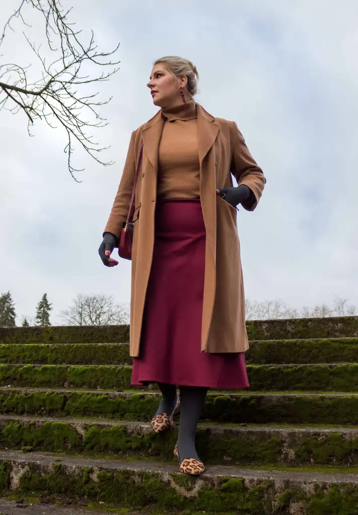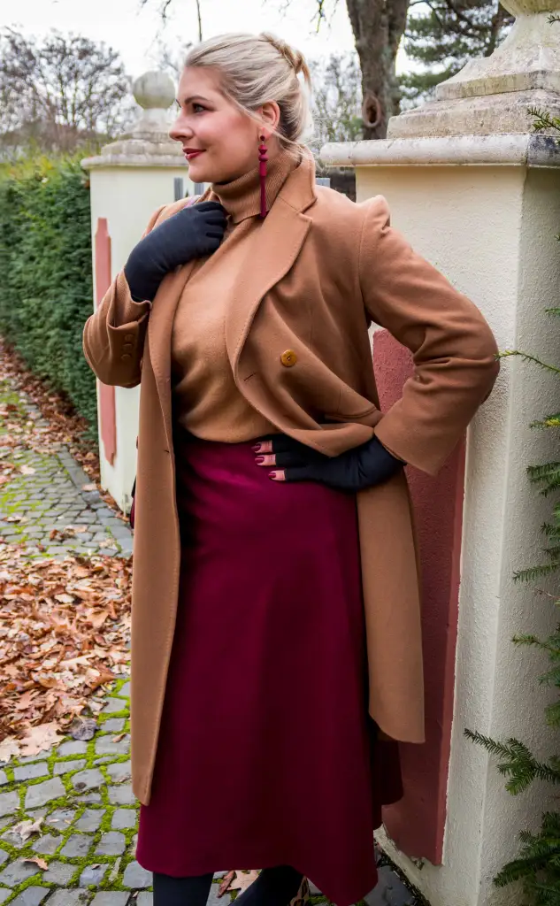Es gibt so einige schöne gedeckte Farben, die die Langeweile aus jedem Outfit verjagen können. Bei diesem Look darf die mediven 550 Flachstrick Kompression in der Farbe Anthrazit sich von seiner vielseitigen Seite zeigen. Das dunkle Grau, mit dem Muster Timeless an den Armen und Ribs an den Beinen, ist lockerer als Schwarz und bietet einen angenehmen weichen Kontrast zu dem weinroten Midirock und Camel des Pullis und Mantels.